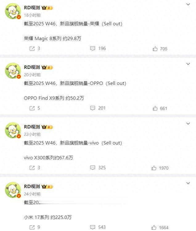 不信大家看行业人士“RD观测”提供的是小米17系列、vivo X300系列、OPPO Find X9系列、荣耀Magic8系列同样截止到W46周的销量数据。数据显示小米17系列目前的销量为225.0万台,vivo X300系列的销量为67.6万台,OPPO Find X9系列的销量为50.2万台,荣耀Magic8系列的销量为29.8万台。看到了吗?截止W46周国产新旗舰仅小米17系列是以百万来计算销量的,剩下那三个全部是以十万来计算销量的,或者可以讲小米17系列的优势越来越大。